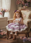 Our adorable vintage lavender dress is exquisite. Its carefully-crafted details, made from high-quality cotton fabric, include a ruffled lace bodice and long ties in back. With multiple layers of fabric, this dress is ideal for special occasions and capturing memorable moments. Accessorize with a matching hairpiece (sold separately).